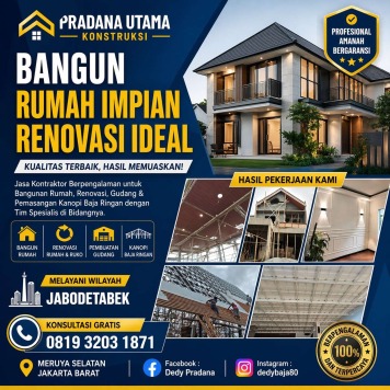 Jika Anda berencana untuk melakukan renovasi rumah, ruko, atau bahkan membutuhkan pembuatan gudang dan pemasangan kanopi baja ringan, Pradana Utama Konstruksi adalah pilihan yang tepat. Kami memiliki pengalaman lebih dari 7 tahun dalam industri konstruksi dan renovasi, dengan spesialisasi di bidang bangunan rumah, gudang, dan atap. Kami juga memberikan layanan di Jabodetabek dengan harga yang terjangkau dan kualitas yang tak tertandingi.